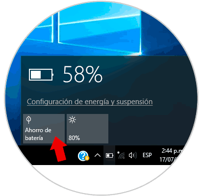En dicho caso, cada plan utiliza diferentes configuraciones para el ahorro de la batería. En Windows 10 podemos acceder al modo de ahorro de batería o las opciones del brillo de la pantalla con sólo hacer clic sobre el icono de la batería que se muestra en la barra de tareas, eso sí, cuando estamos haciendo uso de la batería del portátil.